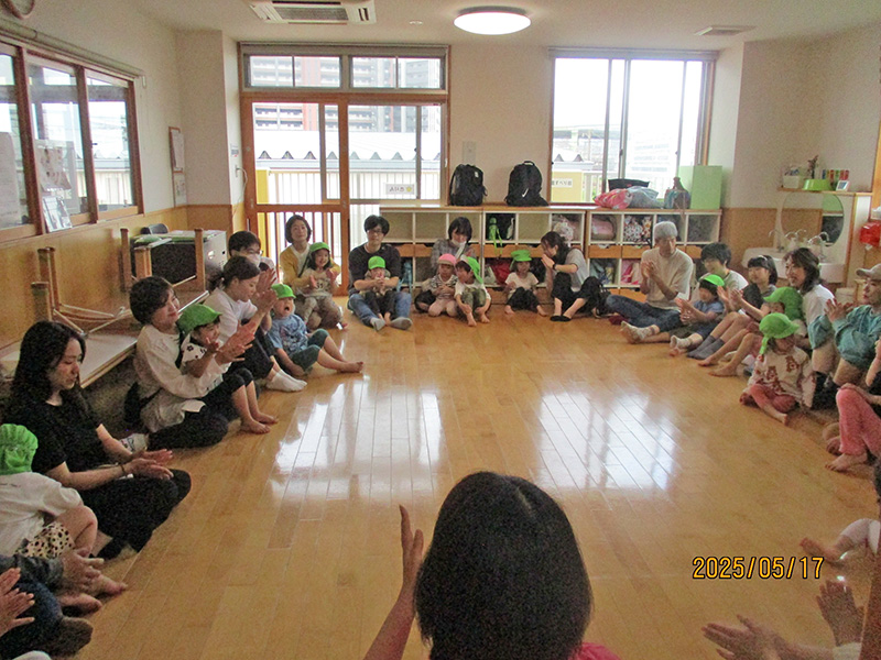 親子遠足(うさぎ・くま・きりん・ぞう組) 2025年5月17日 前日から雨予報だったのでみんなでてるてる坊主を作りました。当日は奇跡的に雨がやんで目的地を勝山公園に変更して散策をしました。勝山公園ではレクレーションや踊りなど親子の触れ合いを楽しみました。その後園に戻っておたのしみのお弁当の時間!みんなで食べるお弁当はとてもおいしそうでした。遠足をたっぷり楽しむことができ思い出に残る1日となりました。
