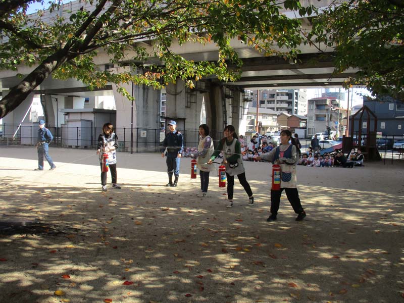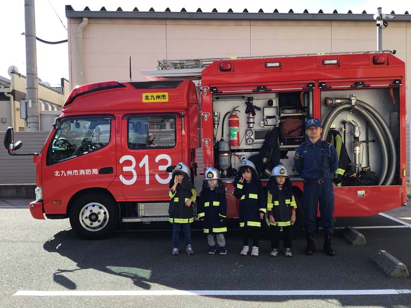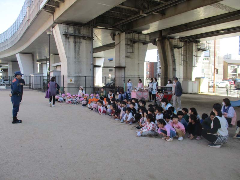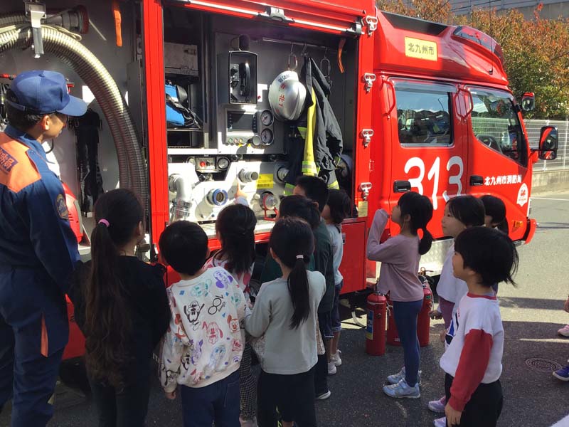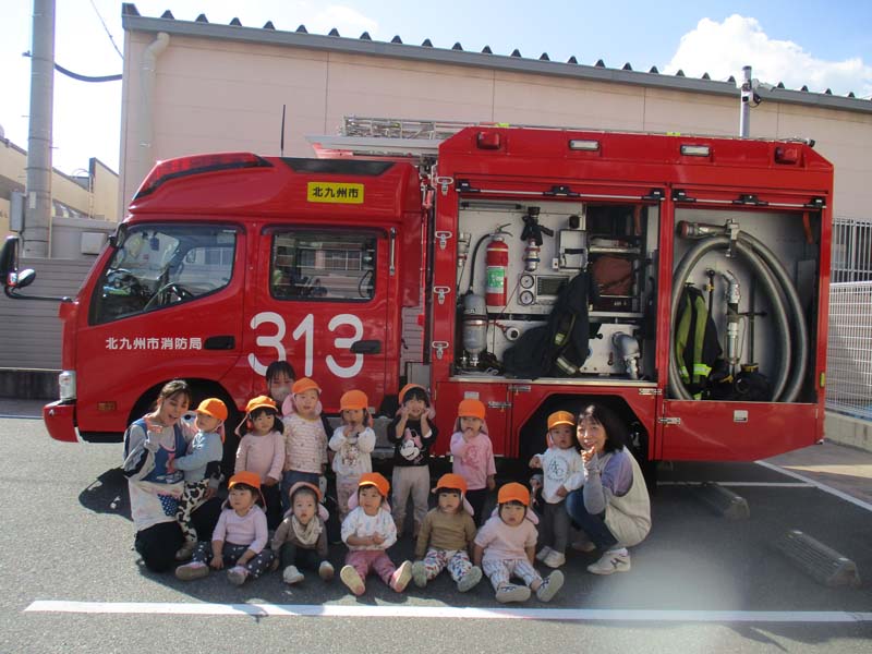 総合避難訓練 2025年11月6日 保育園で北九州市消防局小倉北区消防署との総合避難訓練を行いました。放送が流れると子どもたちは職員の指示を聞き、落ち着いて避難することができました。訓練後には消防士さんから火事の時の約束や避難の仕方についてお話を聞き、職員による消火訓練や実際の消防車の中を見学しました。間近で見るホースや機材に「すごい!」「おおきいね」と目を輝かせる子どもたち。年長児は防火服を着る体験も行いとても嬉しそうでした。今回の経験から改めて、火災への意識や自分の命を守る行動の大切さを学ぶことができました。