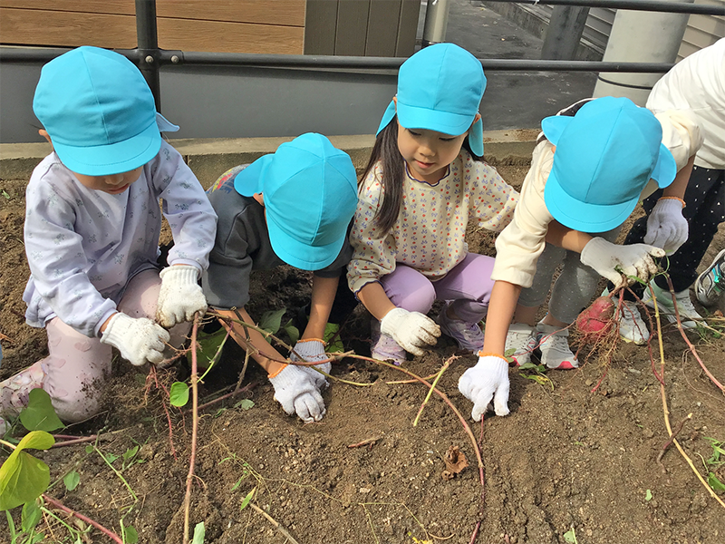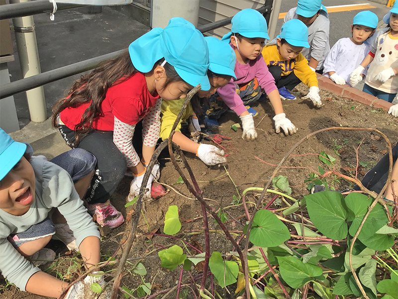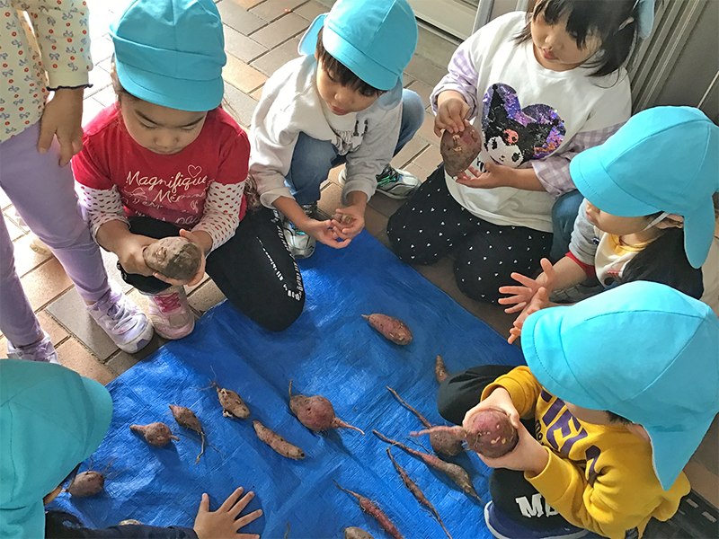 さつまいも収穫 2025年11月4日 5月にさつまいもの苗を植えて収穫しました。5か月間地域の方も一緒に水やりをして下さったお陰で成長したお芋。みんなで力を合わせてつるを引っ張ると色々な形のさつまいもがとれました。収穫したさつまいもを大きさ順に並べて数を数えると49個ありました。