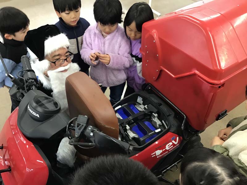 郵便バイクがどのような仕組みになっているか見せてもらった後、バイクにも乗せてもらって子ども達は大喜びでした。