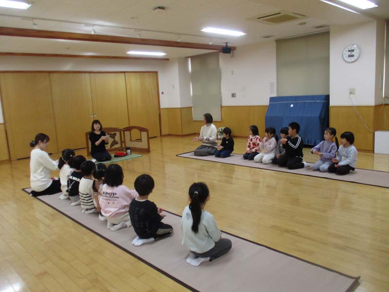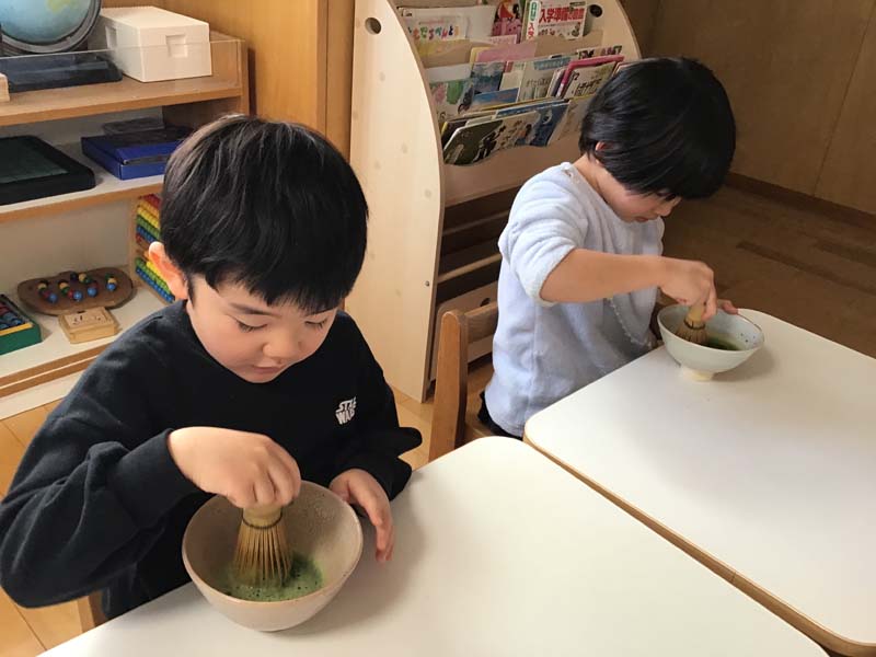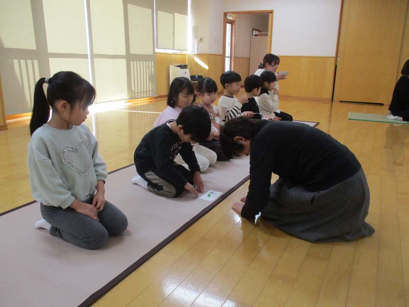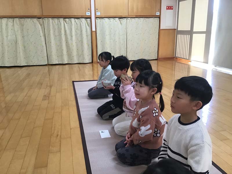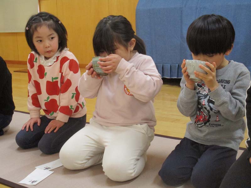 お茶会 2026年1月8日 琴の音が流れる中、最初にお茶をいただく時の作法やマナーを教えていただきました。いつもは元気いっぱいの子どもたちも厳かな雰囲気の中、背筋をピンと伸ばし作法を意識しながらお茶やお菓子を頂いていました。また、お茶会の後に自分でお茶を点てる体験をして、日本の伝統文化に触れる貴重な時間を過ごしました。