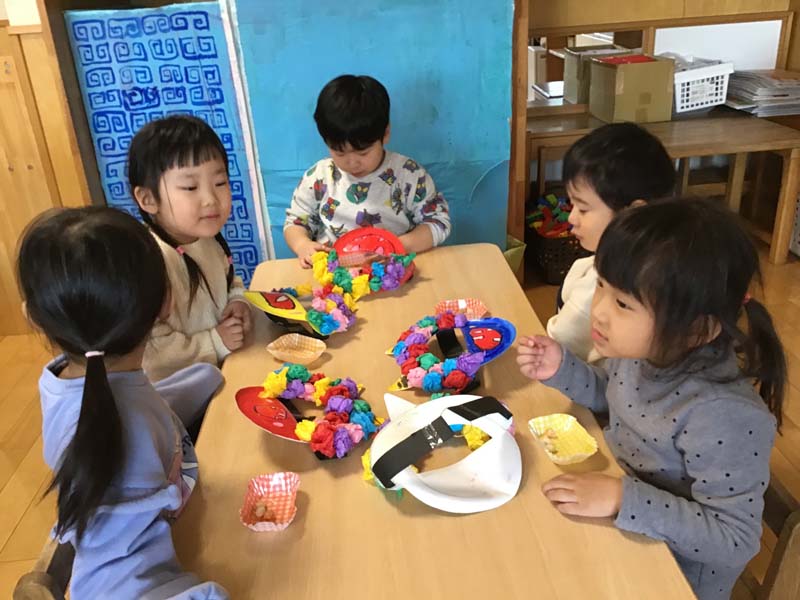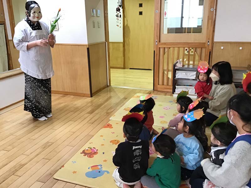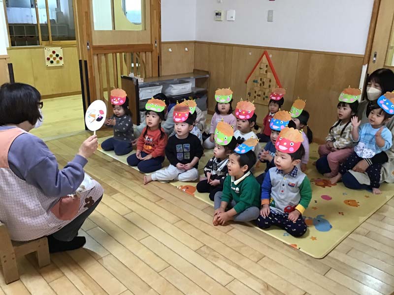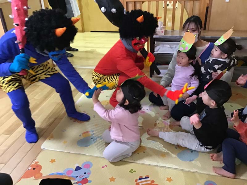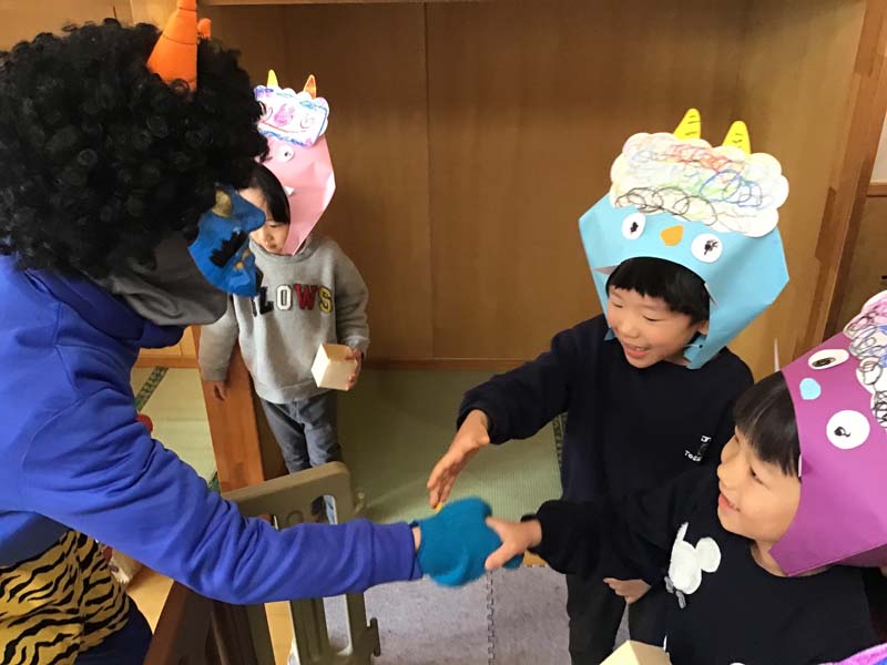 節分 2026年2月3日 2月3日は節分。各クラスごとに節分の由来についてお話を聞きました。そこに鬼が登場!「おにはそと!ふくはうち!」と自分の心の中の鬼も退治しようと勇気を出して豆まきをした子どもたち。豆まきの後には、福の神が春のお花のチューリップを届けに来てくれました。3,4,5歳児の子どもたちには年の数の豆も届けてくれ、みんなで食べながら今年一年健康で幸せに過ごせるよう、願いを込めました。