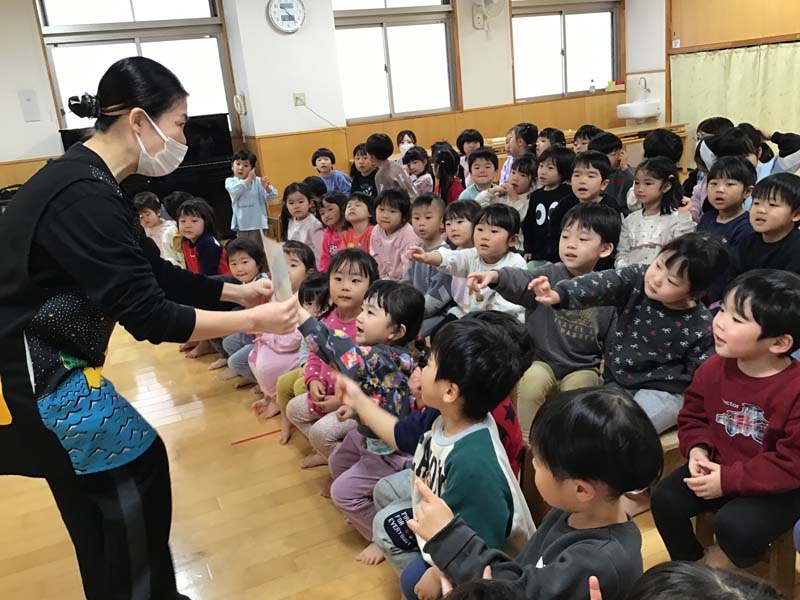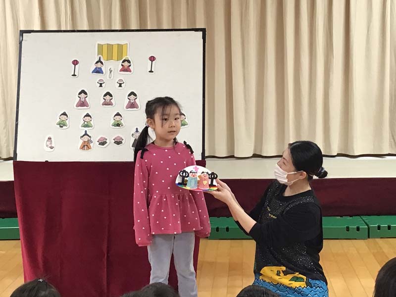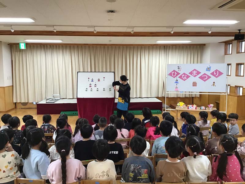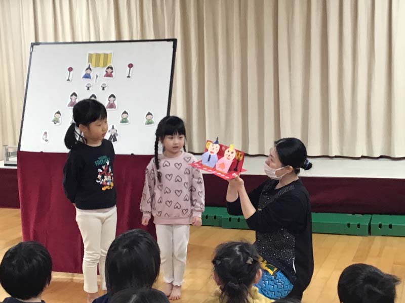 ひなまつり(2歳児以上) 2026年3月3日 / 2歳児以上児が参加しました。ひなまつりの歌をうたったり、ひなまつりクイズで由来を知ることができました。また、おひな様、おだいり様の製作をクラスごとに紹介しました。子ども達から作品の作り方や工夫した所など教えてくれました。どのクラスもかわいいおひな様ができました。