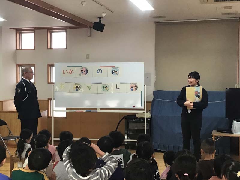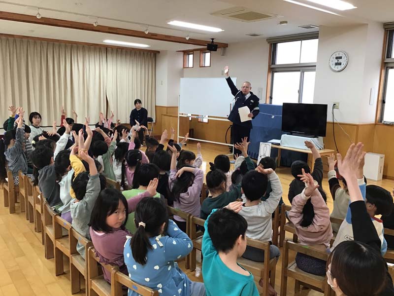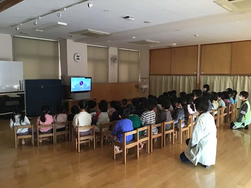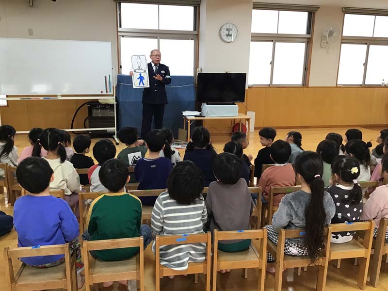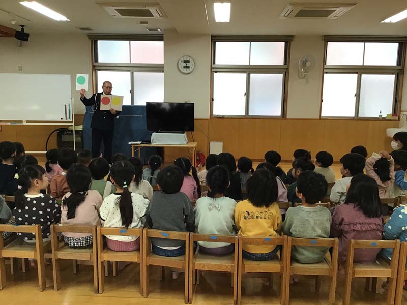 交通安全教室(3歳以上児) 2026年3月4日 小倉北区警察署の方に来て頂き、交通安全と防犯・不審者への対応について教えて頂きました。「と・し・おくんのおやくそく」や「い・か・の・お・す・し」は子ども達も覚えていて、手をあげて元気に発表していました。遠足の時に気をつける事や、歩道の歩き方など交通ルールの大切さを改めて学ぶ機会となりました。