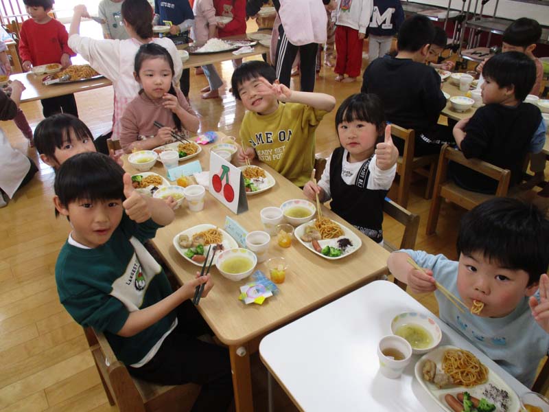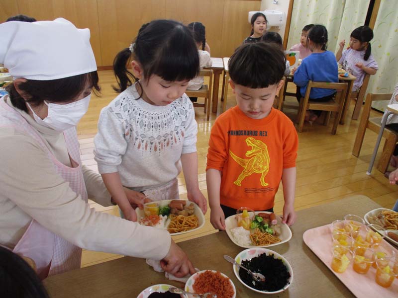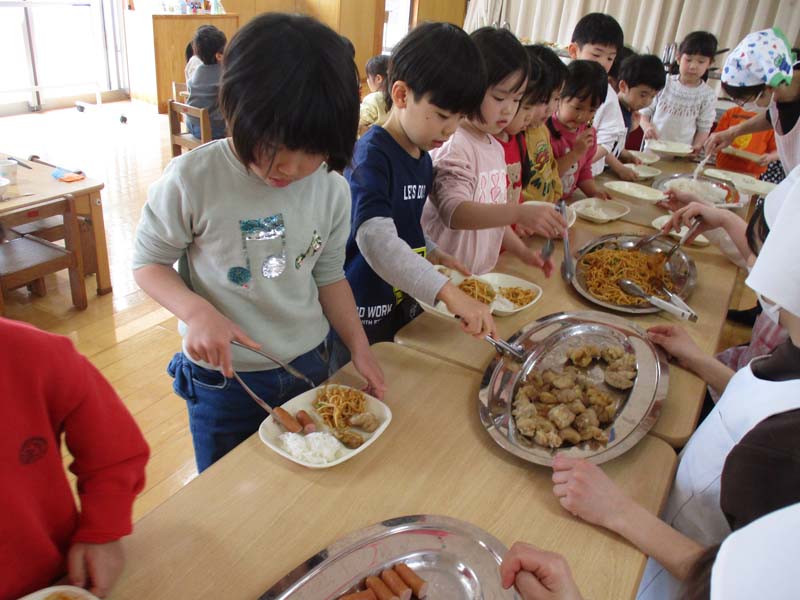 お別れ会のあとは、お別れ会食を行い、みんなでバイキングを楽しみました。この日のメニューは、ぞう組の子どもたちからのリクエストで決定しました。